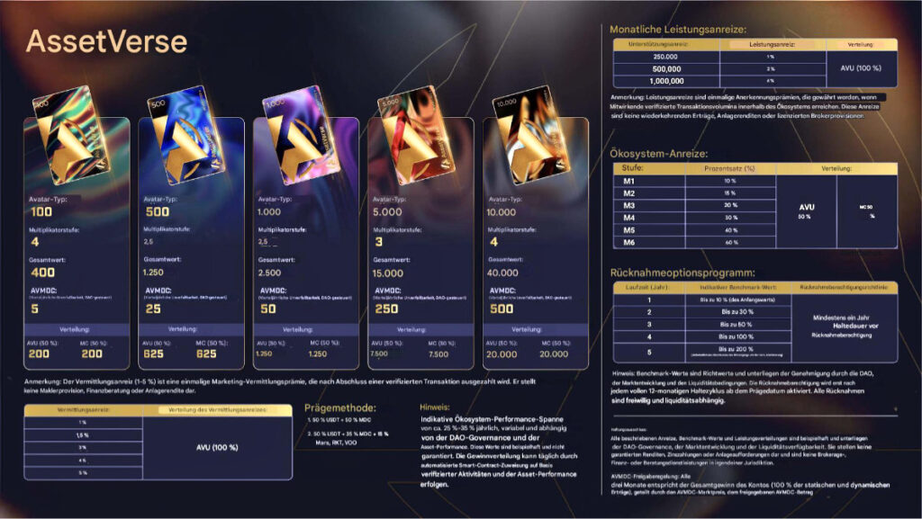 Die Einnahmen bzw. Rewards eines AssetVerse Avatars werden nicht vollständig in einer stabilen Währung ausgezahlt, sondern aufgeteilt. 50% werden  als StableCoin (AVU =  USDT) ausgezahlt. 50% erfolgt in Form des Ökosystem-Tokens MC.